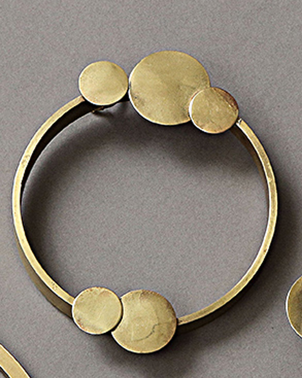 Round wall frames of polished brass disks of various sizes.