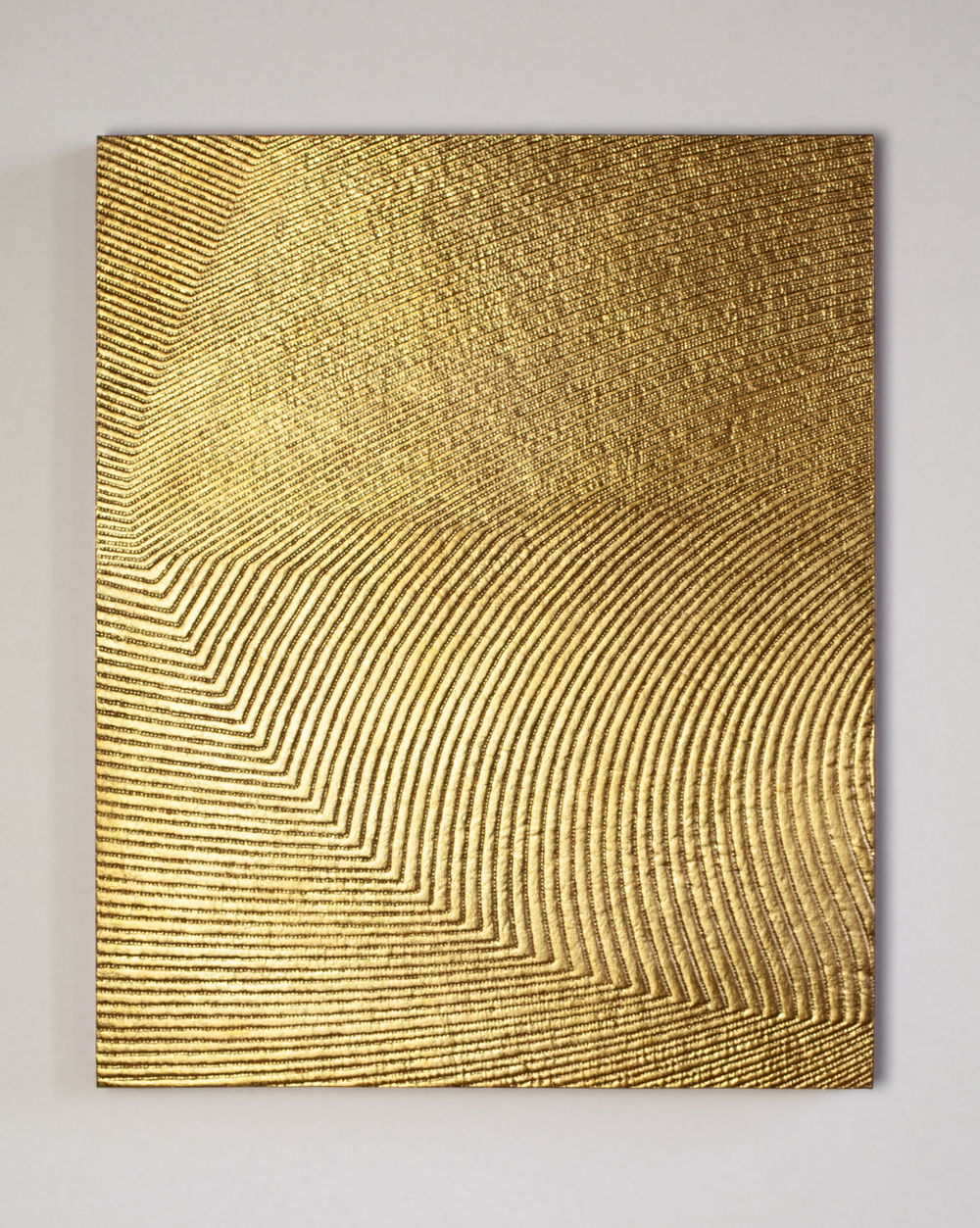 Quilted textile on panel with 24K gold leaf and red oxide fixed to a wood cradled panel.