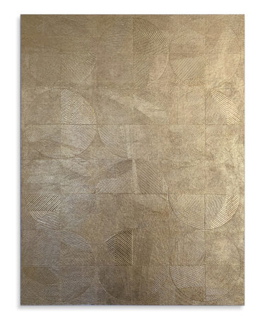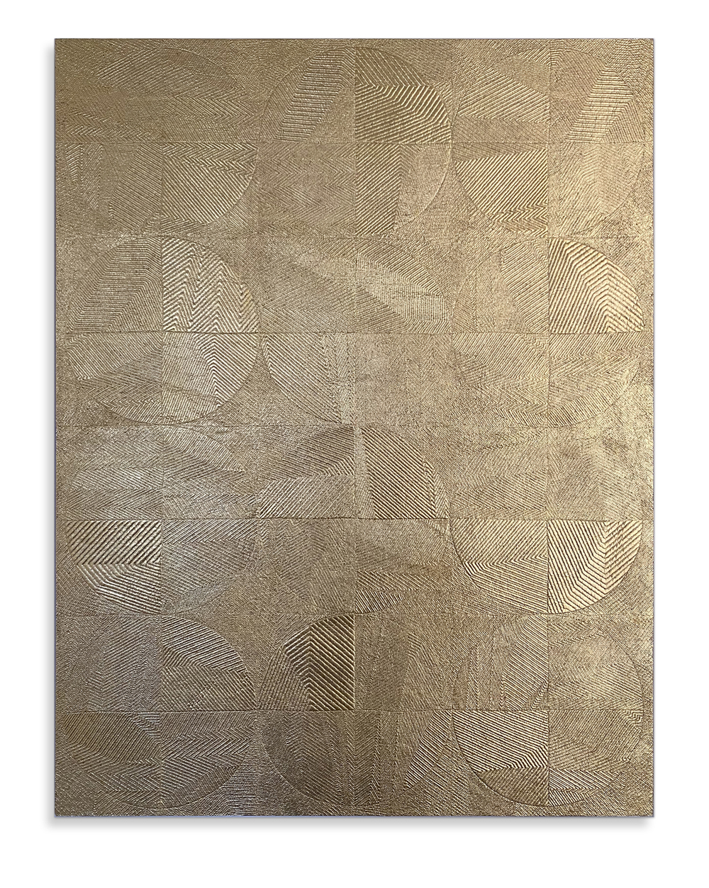 Quilted textile on panel with 24K gold leaf and red oxide fixed to a wood cradled panel.