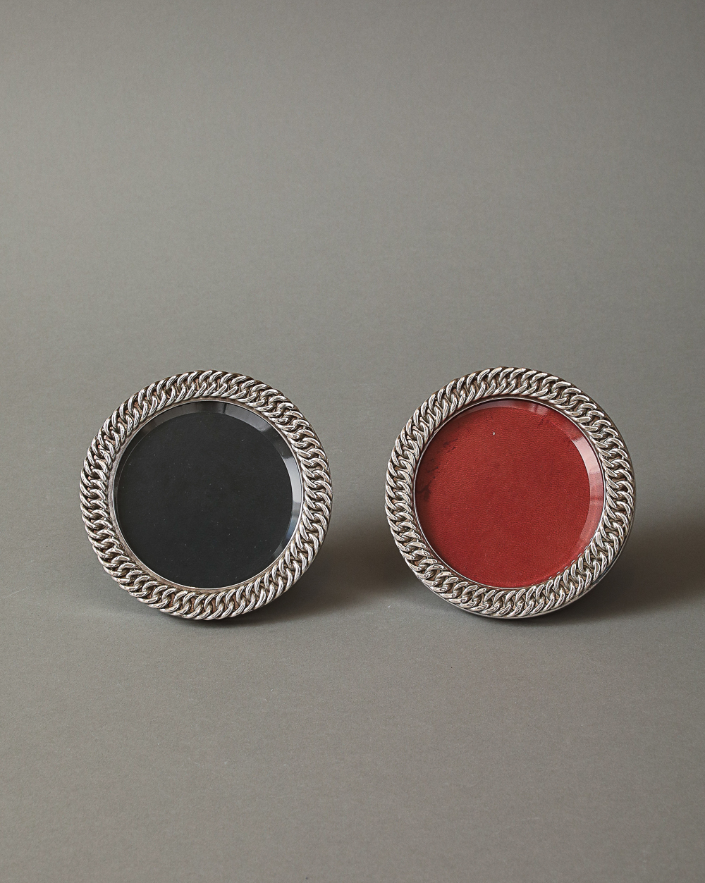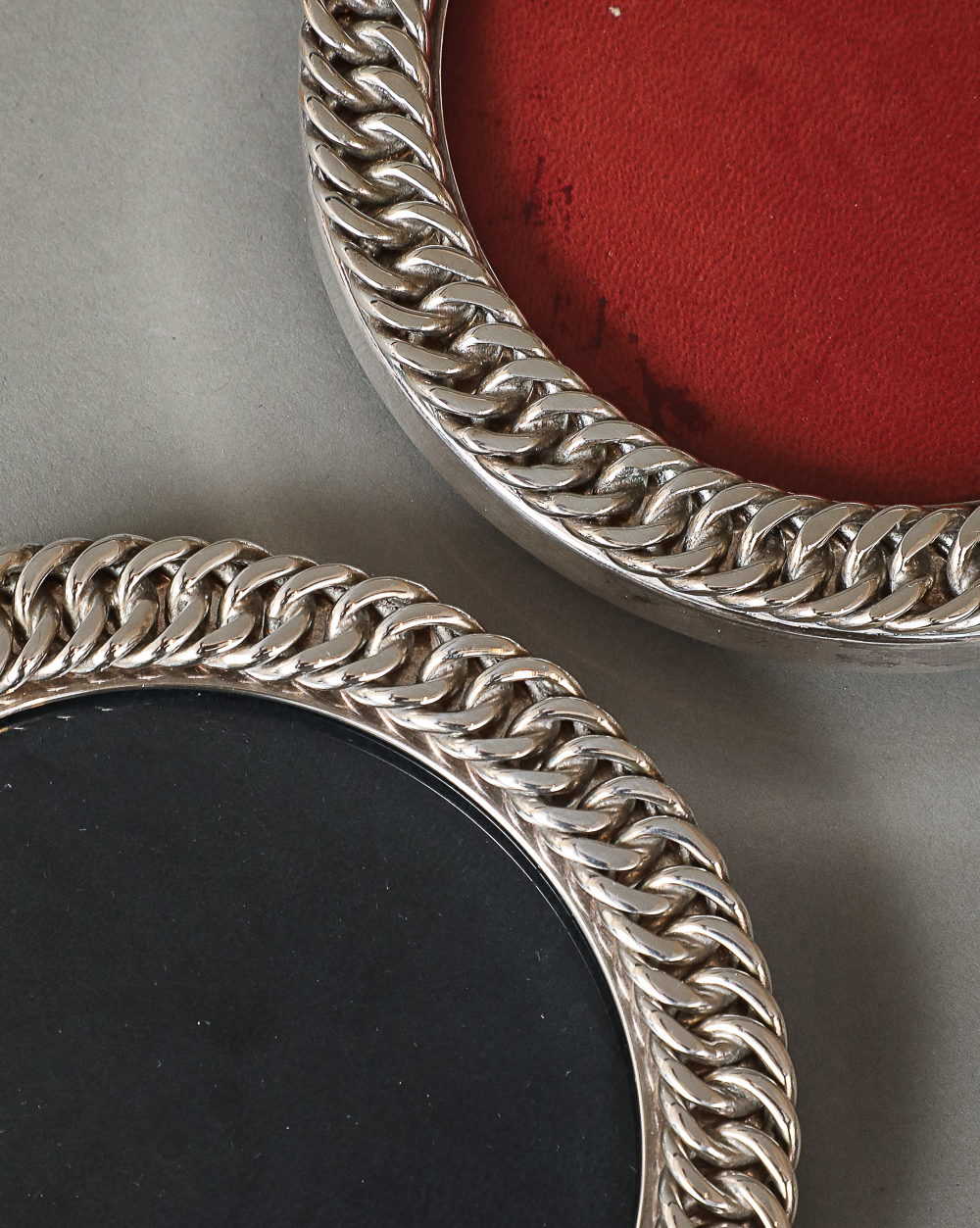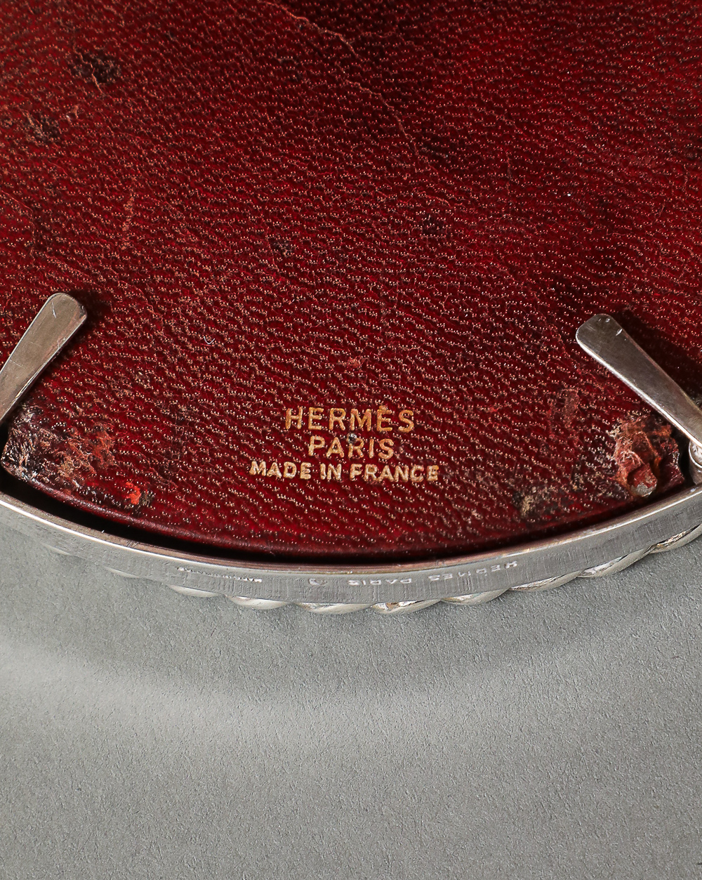 Silver plate chain link photograph frame. Embossed HERMES PARIS Made in France. Silversmith hallmark RAVINET D’ENFER (initials R D with a clover).