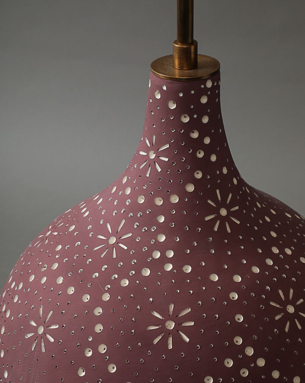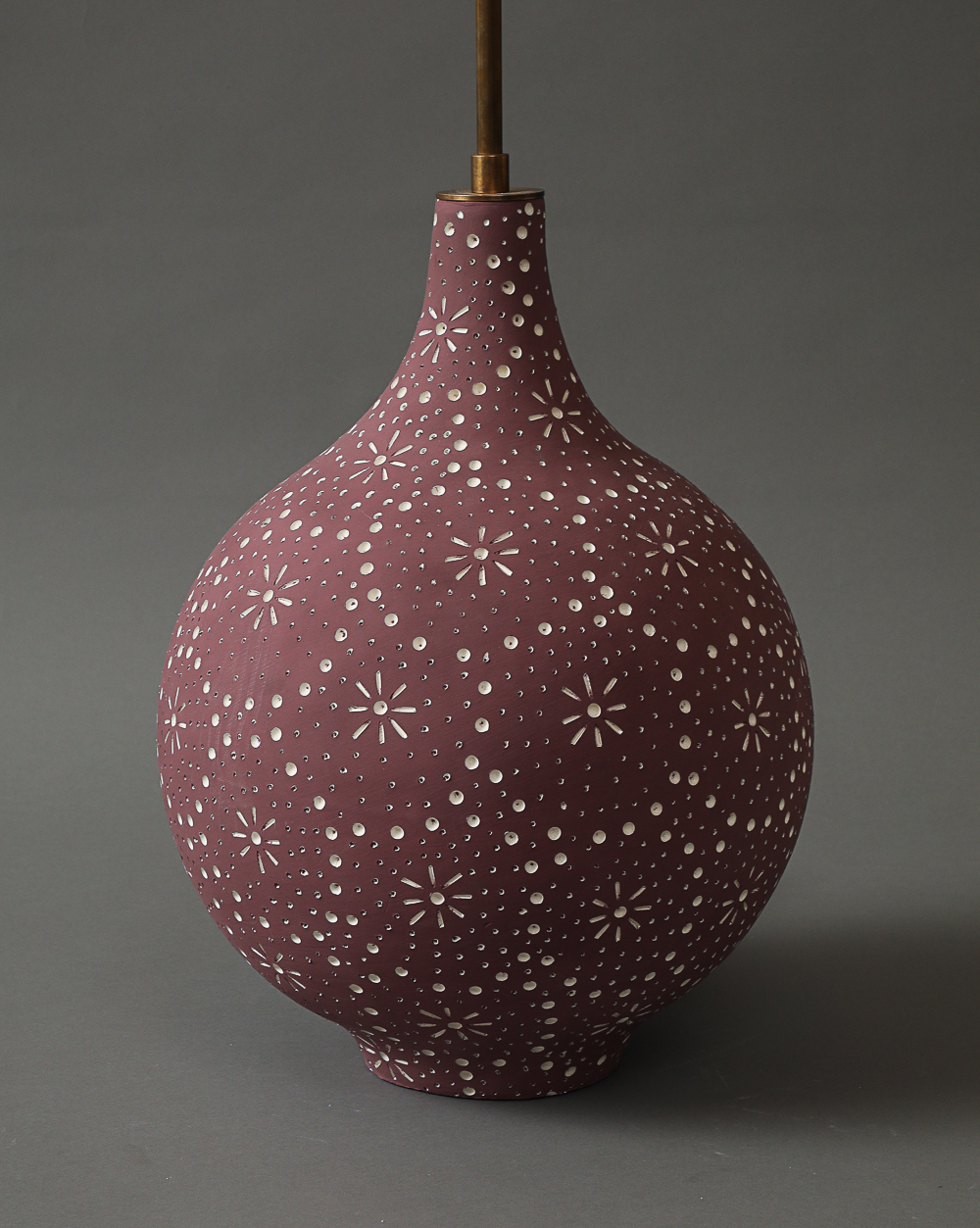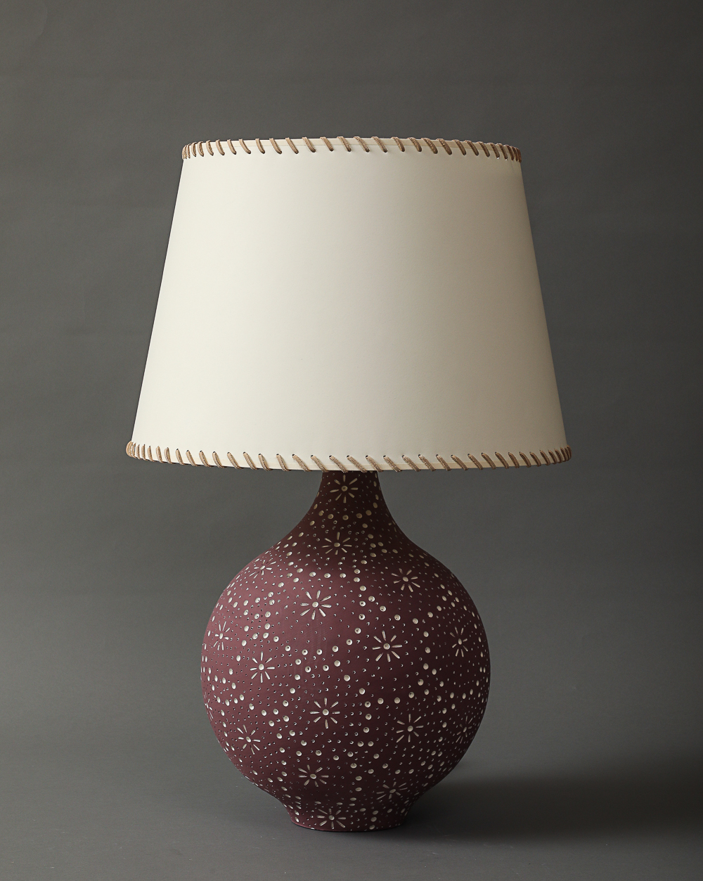 Ceramic stoneware table lamp with spherical form on foot with white hand carved drawing into a plum background.