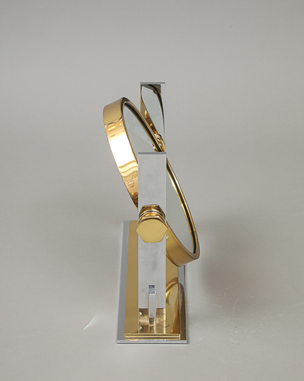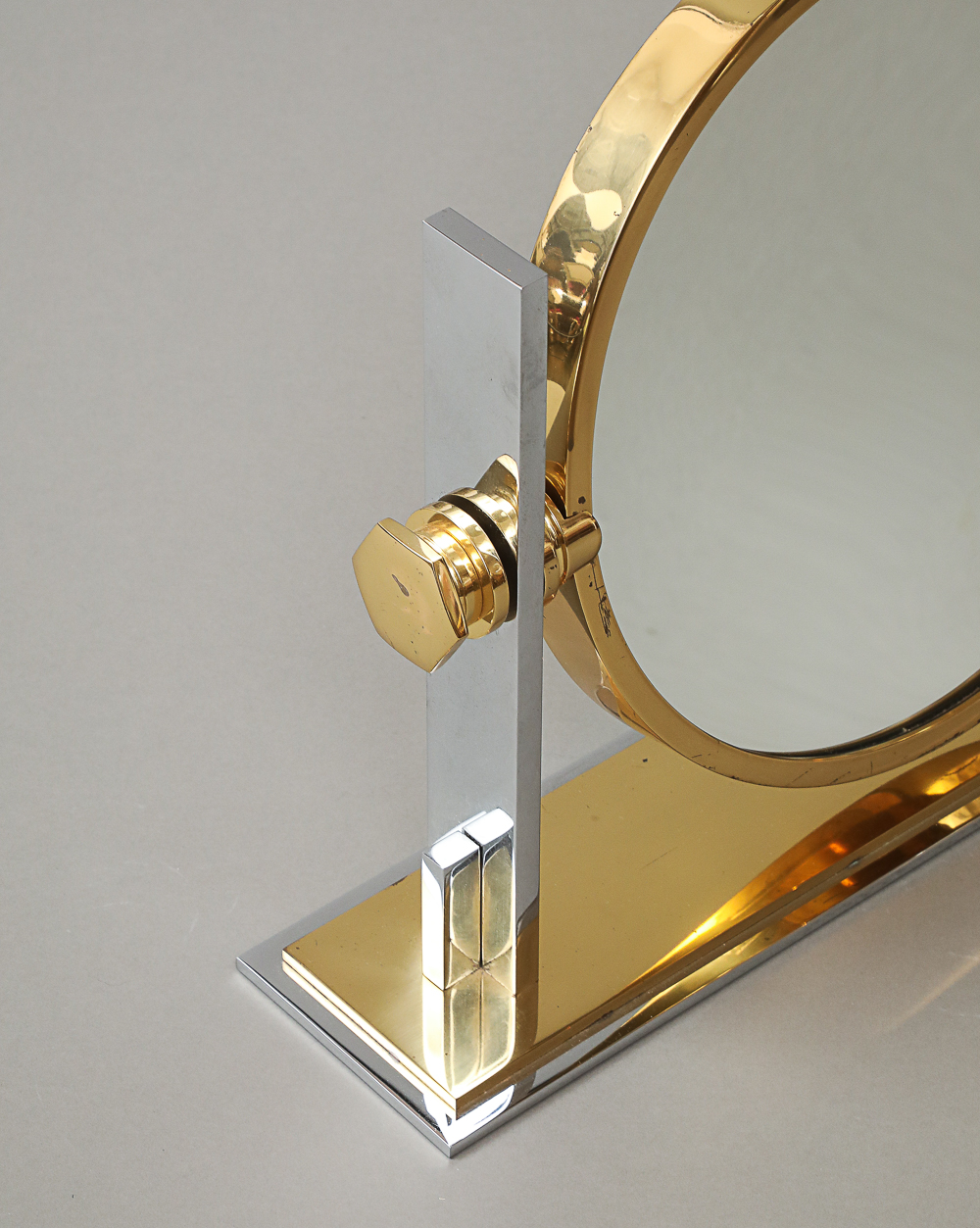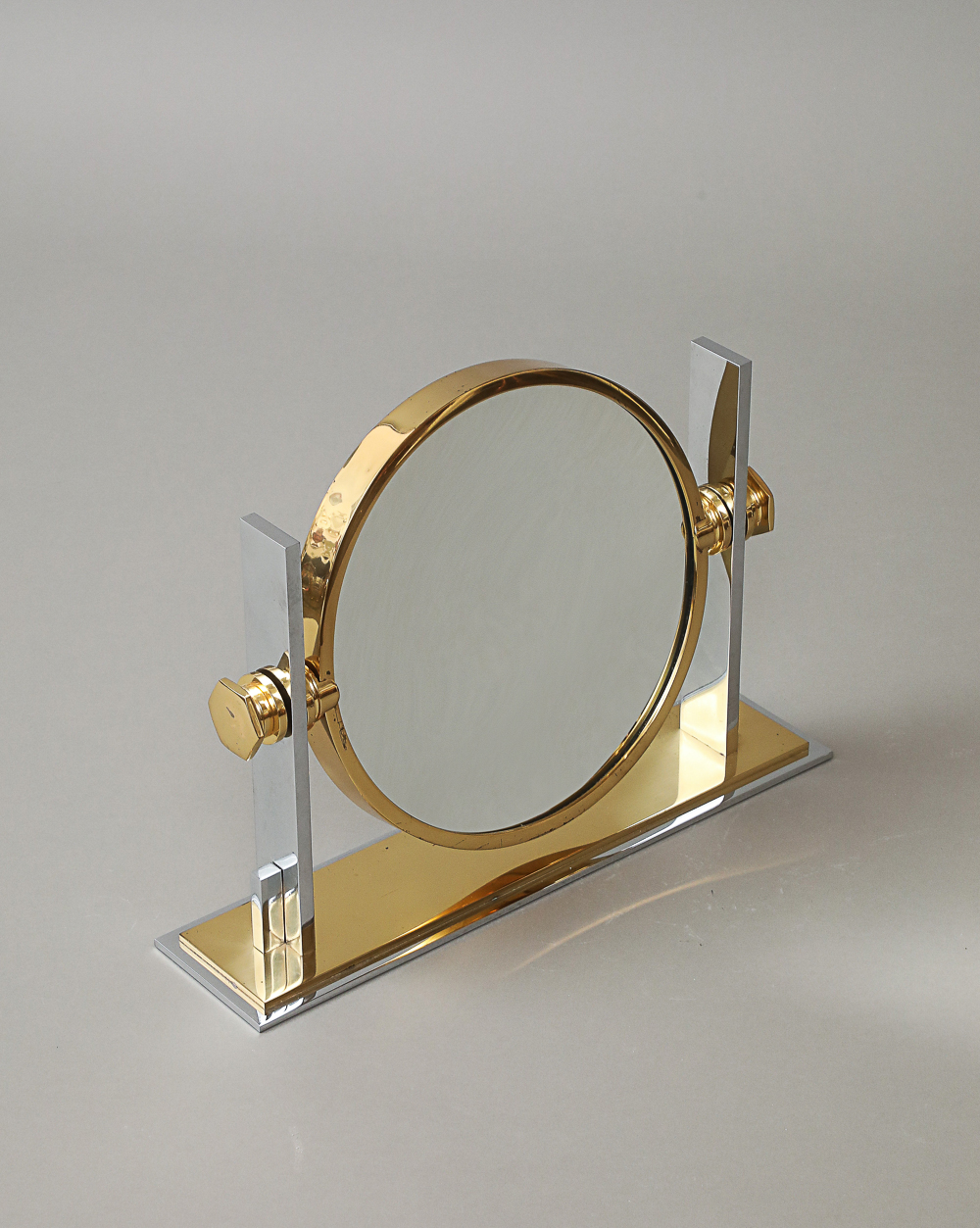 Tabletop double-sided pivoting mirror in polished brass and nickel with magnifying glass on reverse.