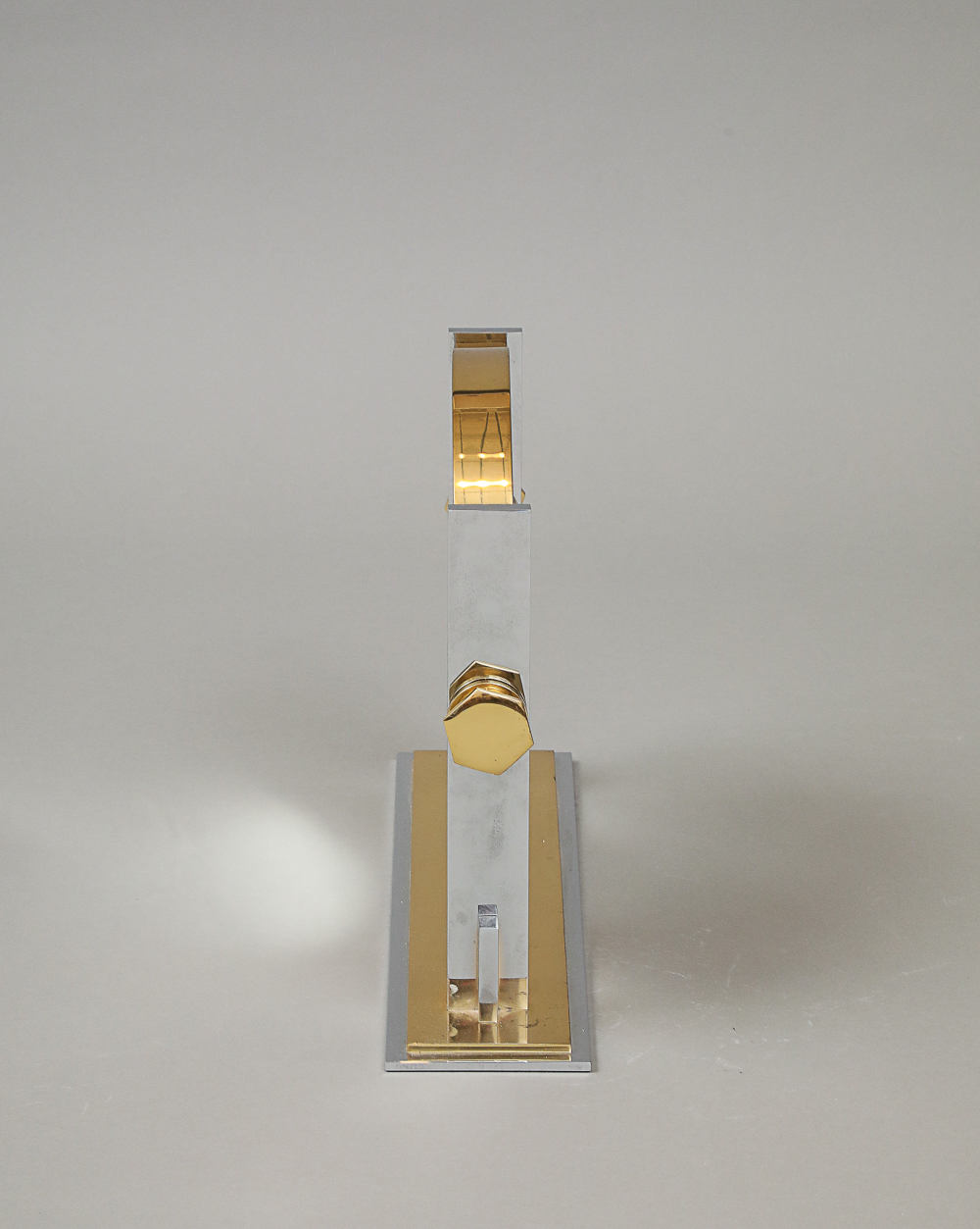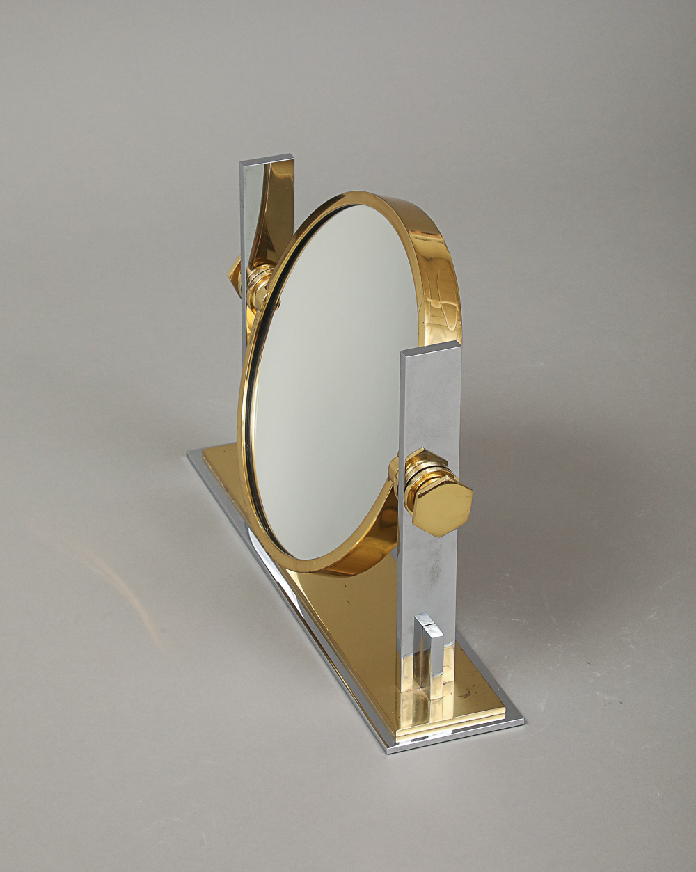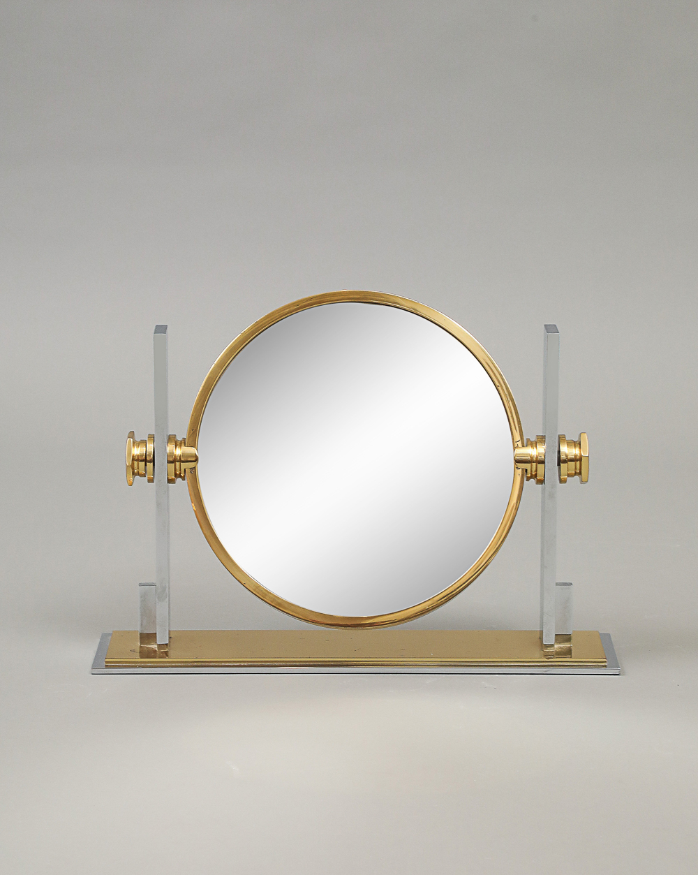 Tabletop double-sided pivoting mirror in polished brass and nickel with magnifying glass on reverse.