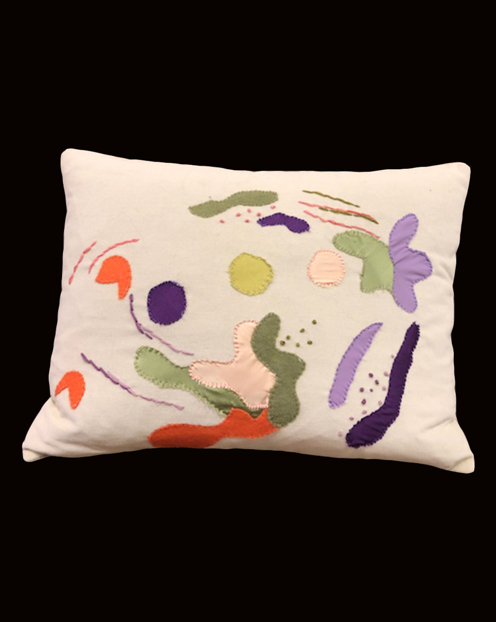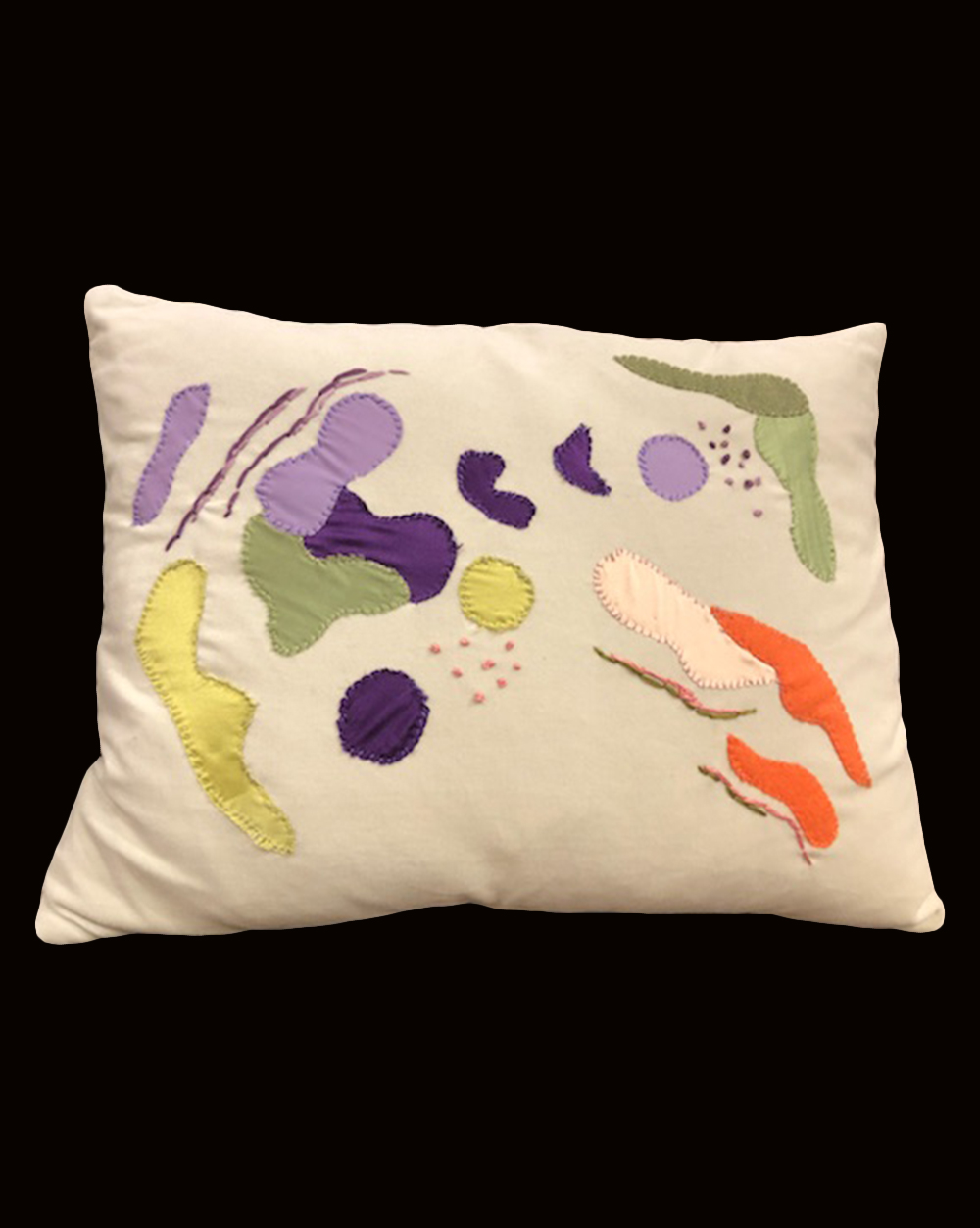 Near pair of hand-appliqued and embroidered lumbar pillows. Each one is unique. Custom inquires welcome