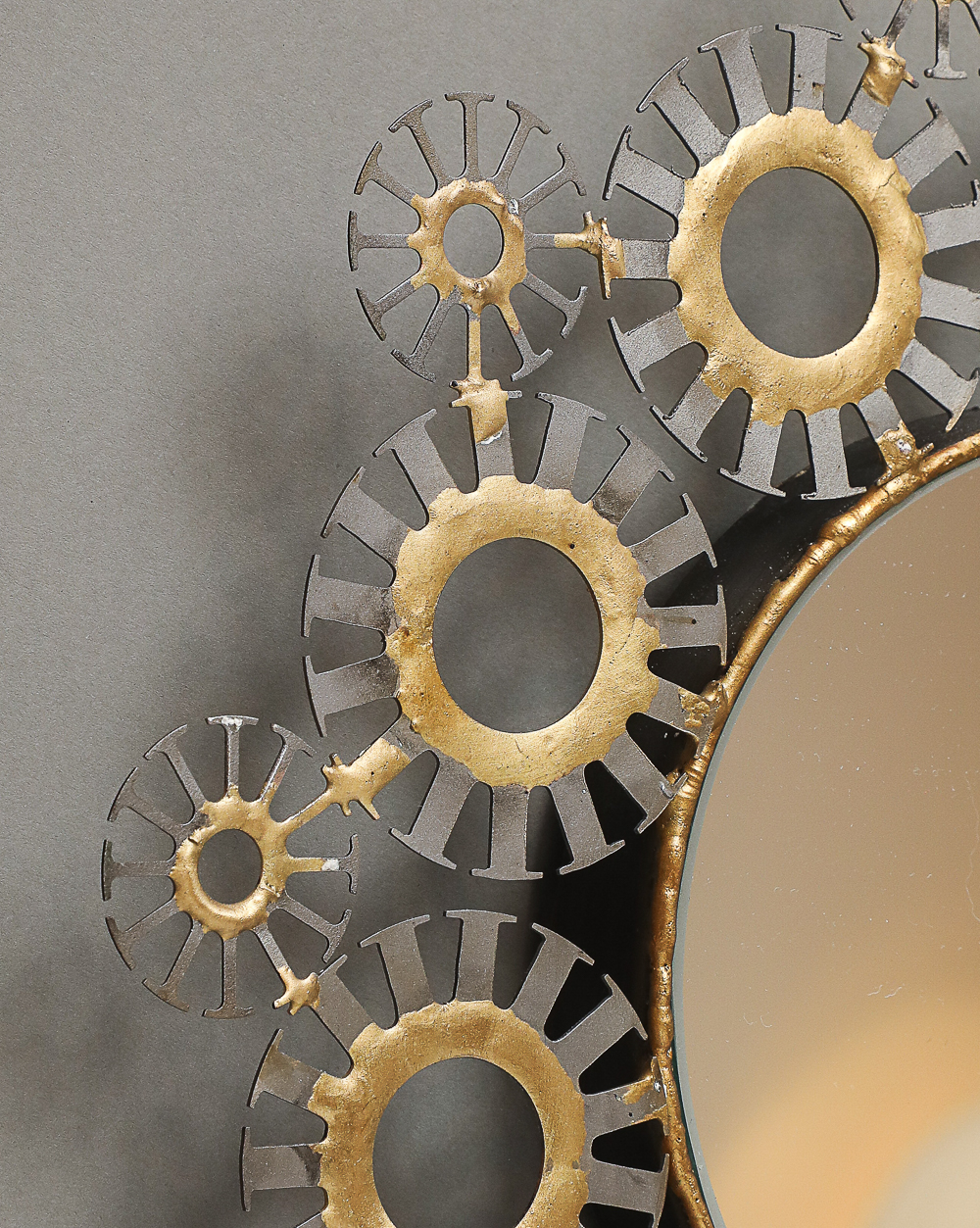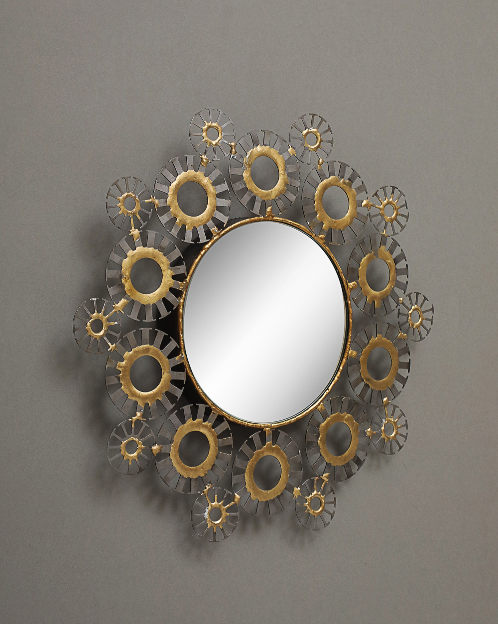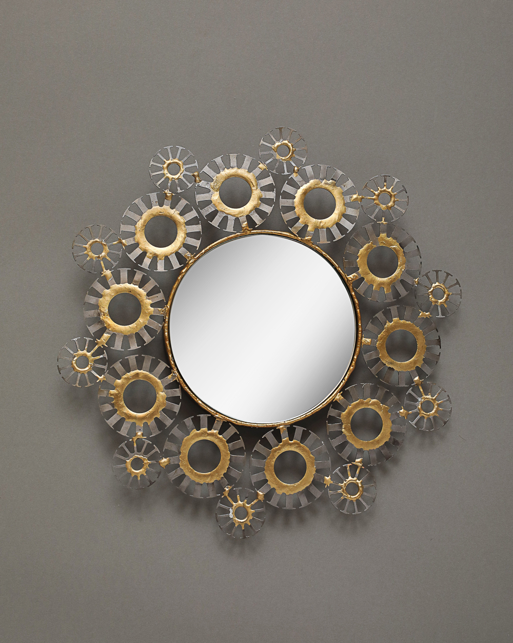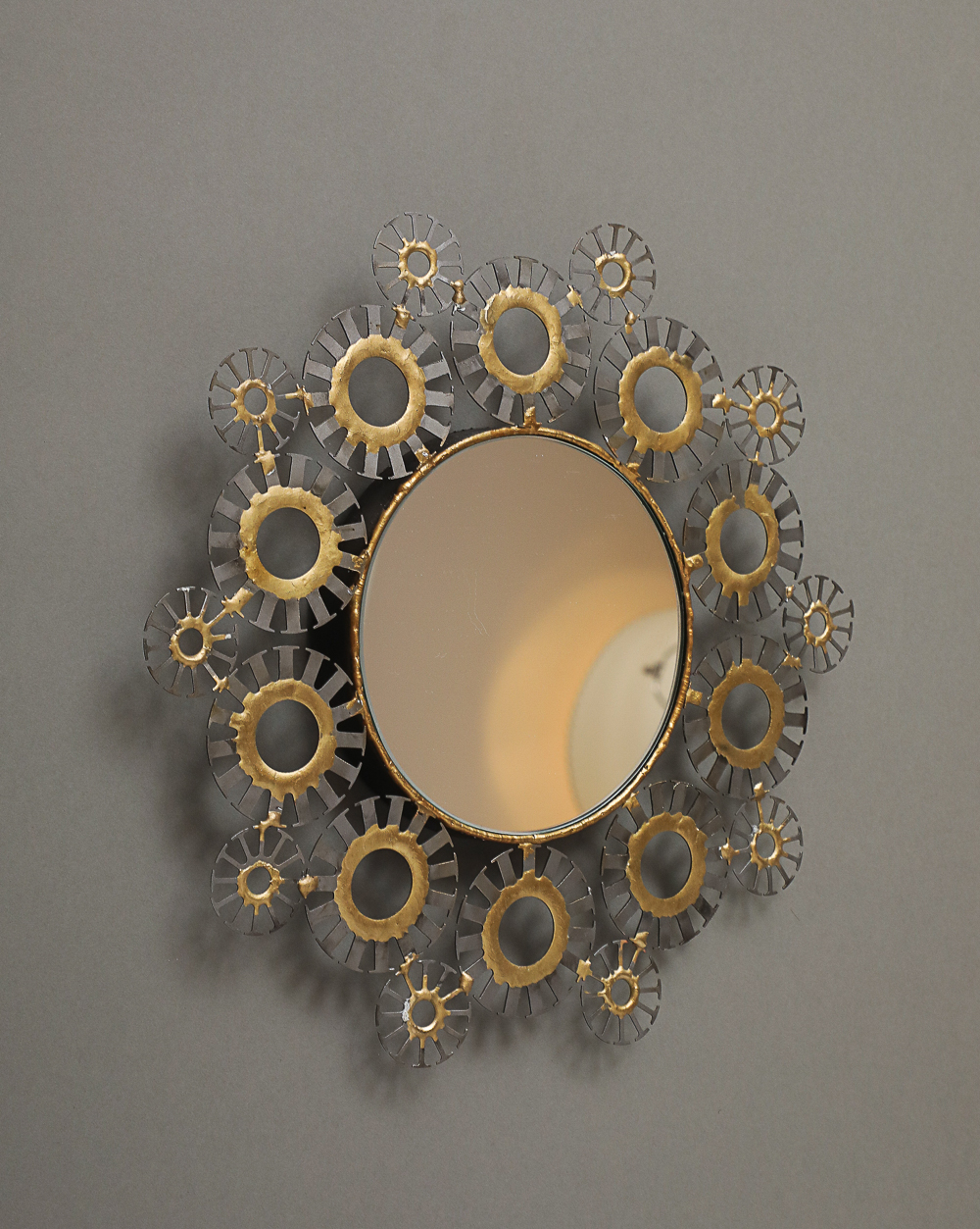 Round wall mirror with 2 row frame of mixed size steel medallions and bronze decoration.