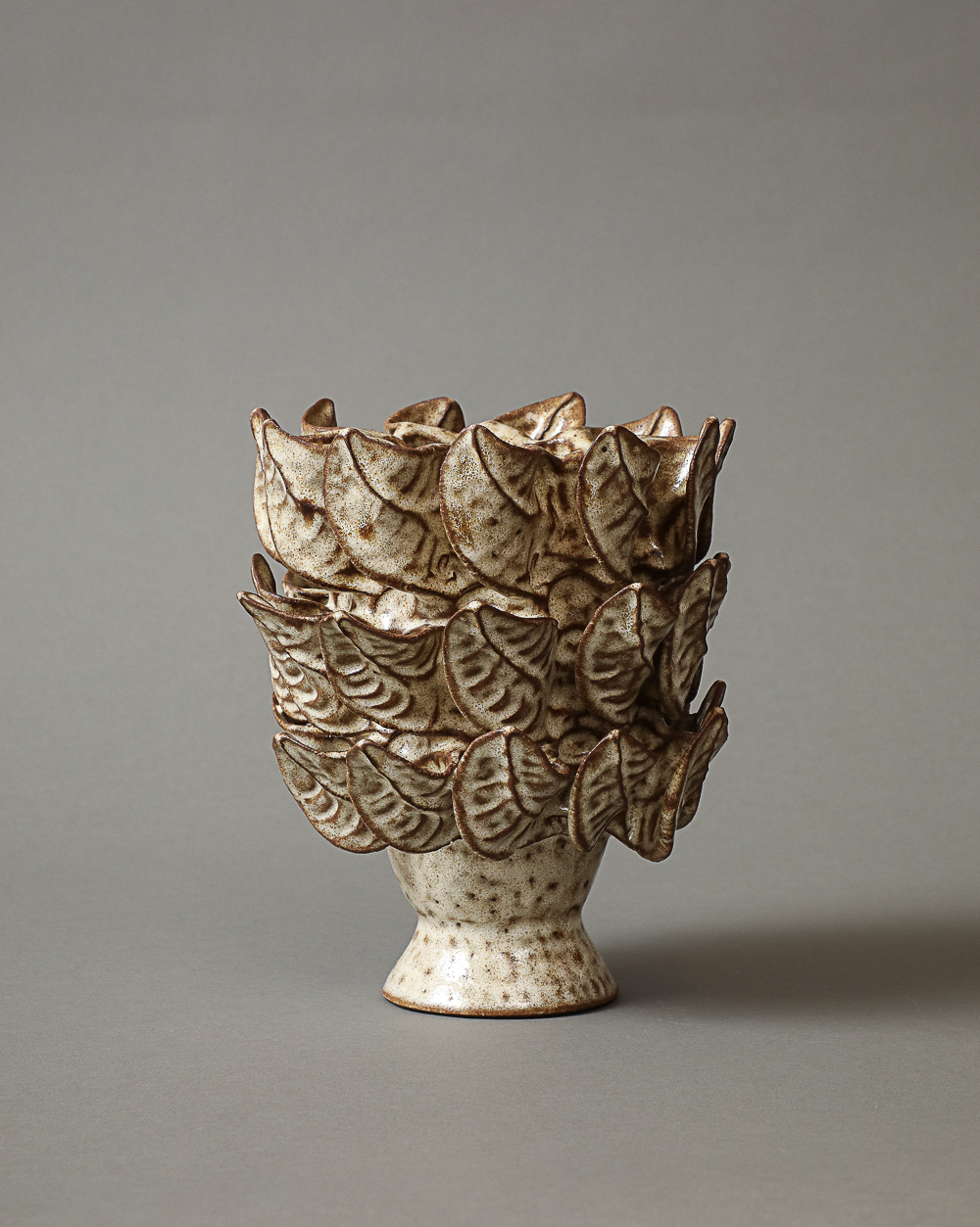 Creamy white glaze over hand-built pinched pot in black clay.
