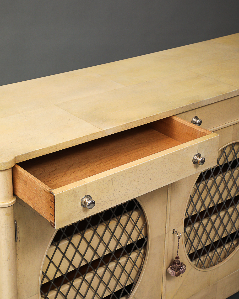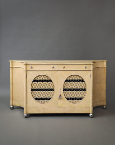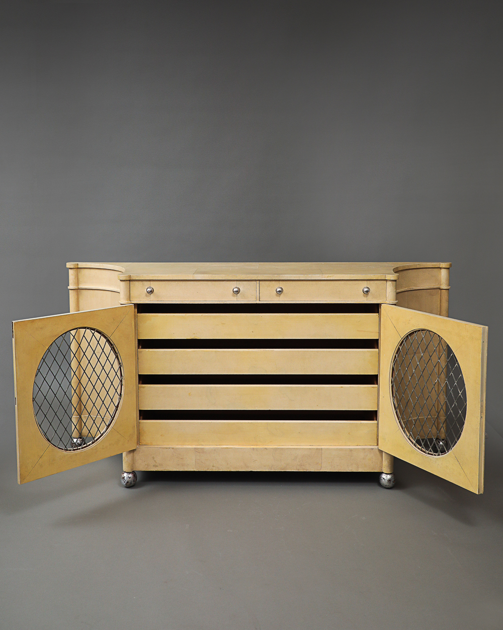 Regency style 2-door cabinet that opens into two pull drawers and four sliding shelves.