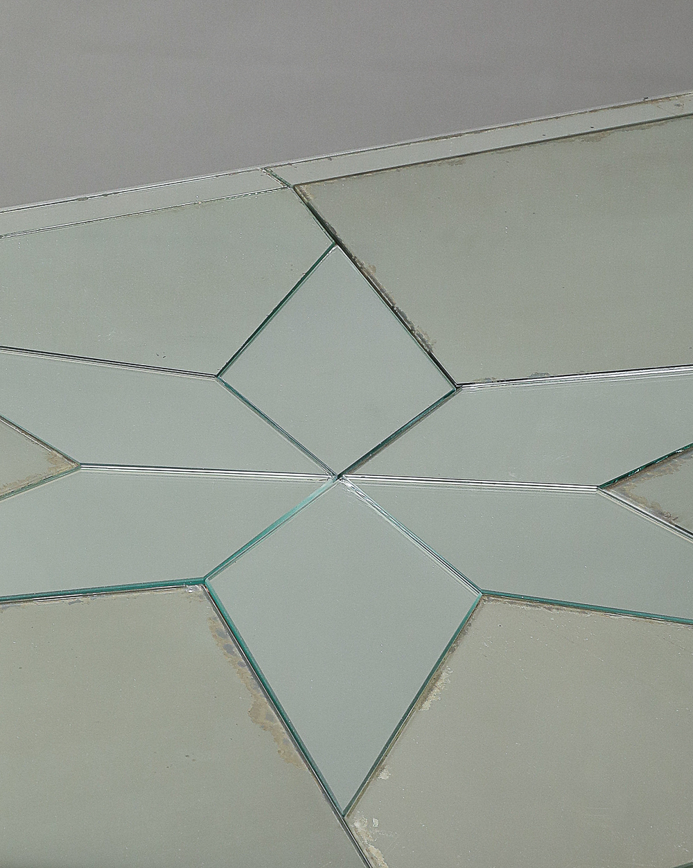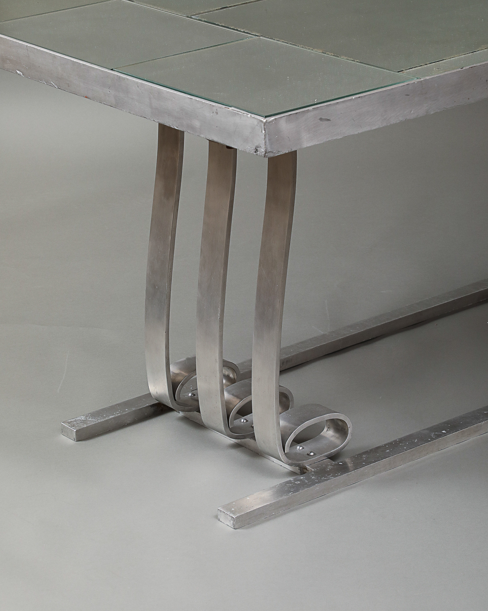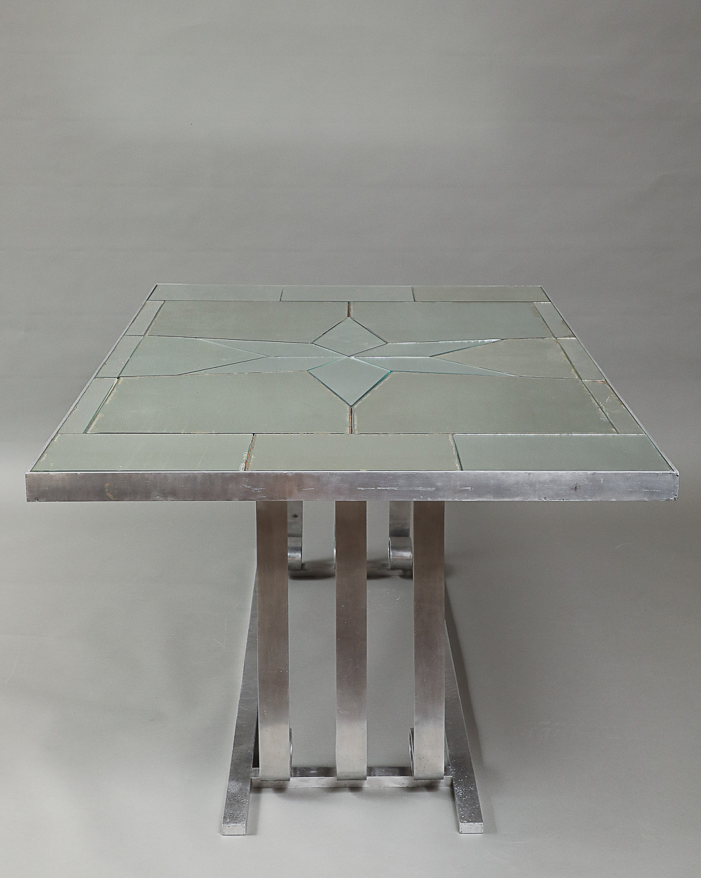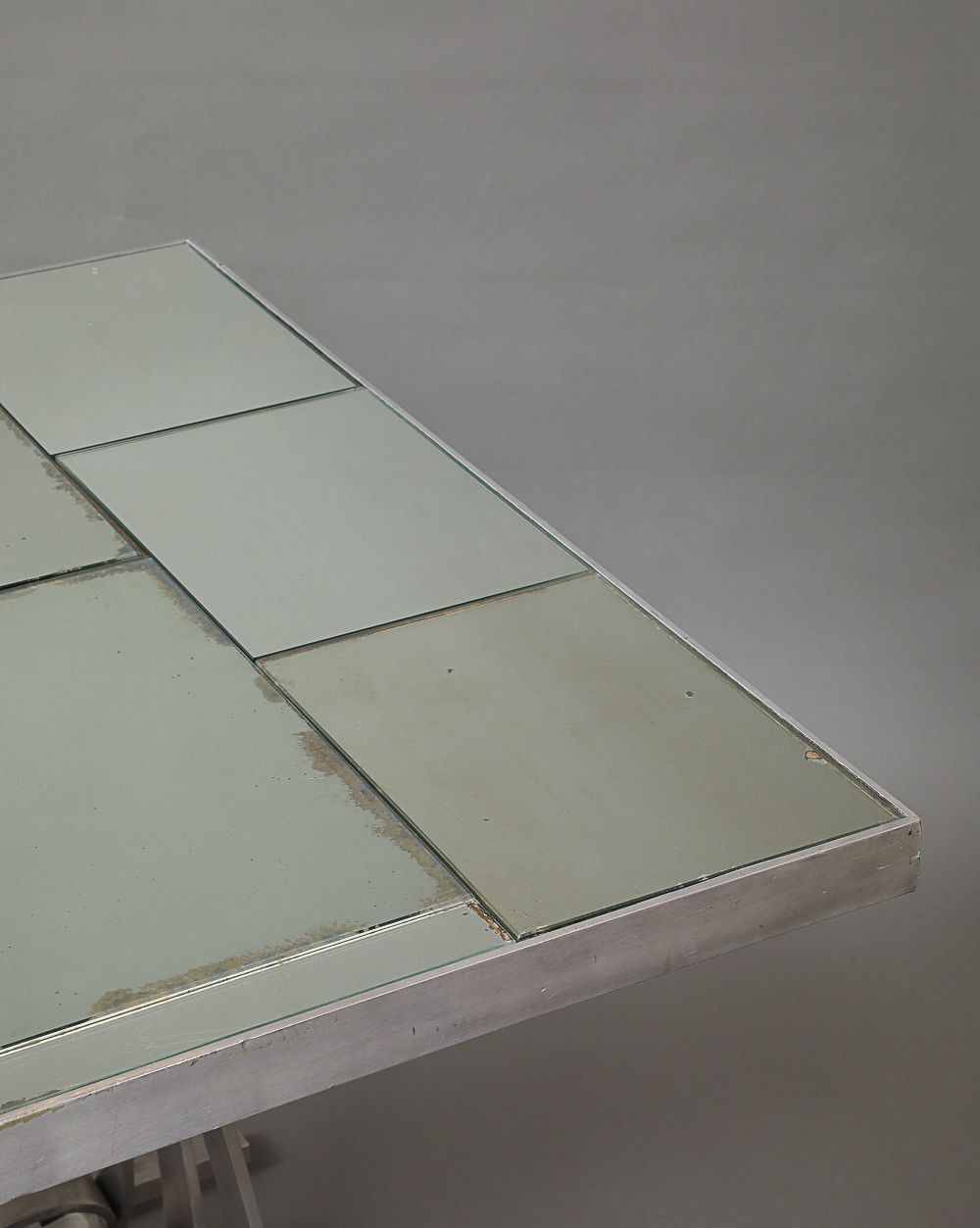 Rectangular table with connected double pedestal scrolling leg aluminum base on runners with inset antiqued mirror glass top with sectioned panels in a starburst pattern.